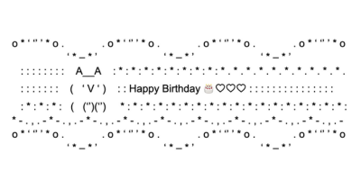 ┏━━━━━━━━━━━━━━━━┓ ┃ Happy Birthday!┃ ┃   ☆            ┃ ┃  ☆☆☆  ┏━━┓ ┏━━┓┃ ┃ ┏┃┃┃┓ ┃┓ ┗━┛ ┏┃┃ ┃┏┻━━━┻┓┗┫ > < ┣┛┃ ┃┃     ┃ ┃  ▼  ┃ ┃ ┃┗━━━━━┛ ┃┏┓┻┏┓┃ ┃ ┗━━━━━━━━┻┻┻━┻┻┻━┛