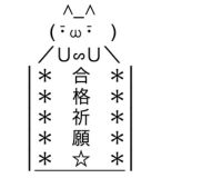 ⠀⠀⠀⋀_⋀ ⠀⠀(・̄ധ・̄) ⠀/U∽U\ │* 合 *│ │* 格 *│ │* 祈 *│ │* 願 *│ │* ☆ *│  ̄ ̄ ̄ ̄ ̄